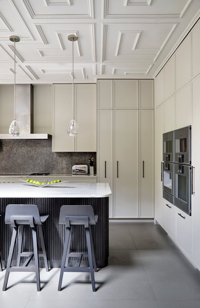This bespoke kitchen is the embodiment of understated luxury. The design, centred around a large island, exudes an aura of elegance. It features a white composite quartz worktop and pale-grey spray-painted cabinets handcrafted at our workshop in West London. The integration of hexagonal metallic splashback tiles and matching brass handles infuses modernity into the kitchen.