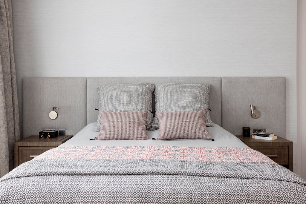 The thoughtful addition of a walk-in wardrobe offers seamless access to an elegant ensuite bathroom. A bespoke upholstered headboard anchors the bedroom, setting a serene backdrop for restful nights.