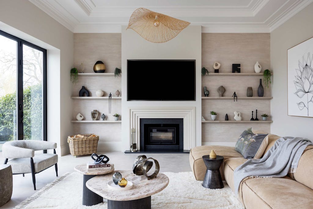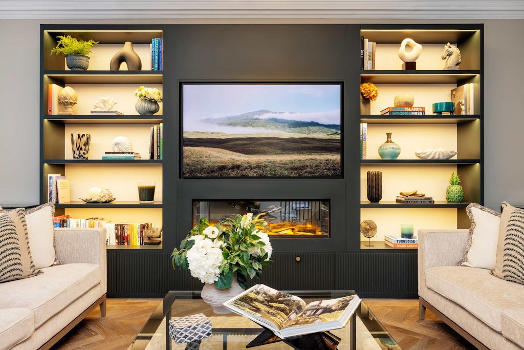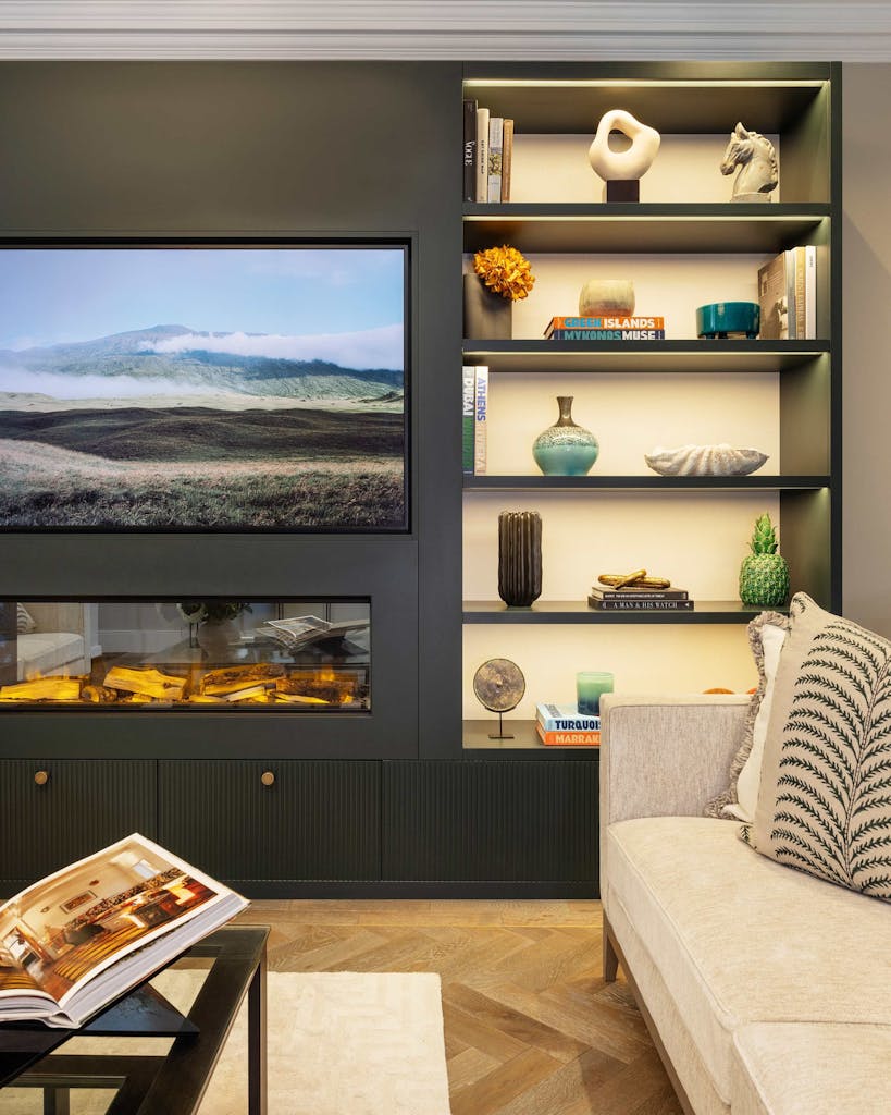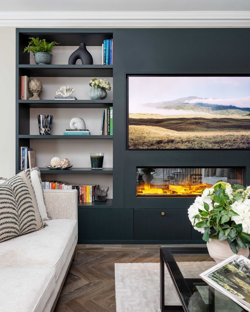 One of the most striking trends in modern interiors is the feature wall of bespoke joinery, often designed to incorporate a fireplace, TV, or both. These architectural focal points bring balance and sophistication to a room, blending warmth, technology, and design into a seamless whole.