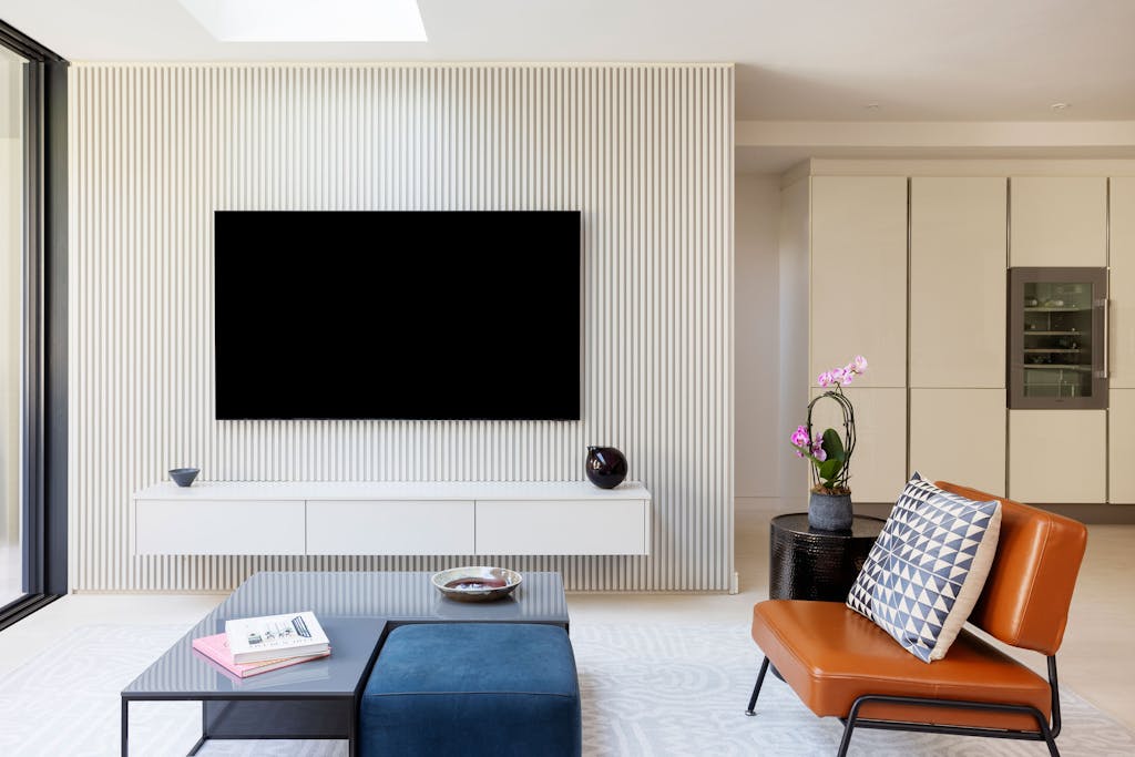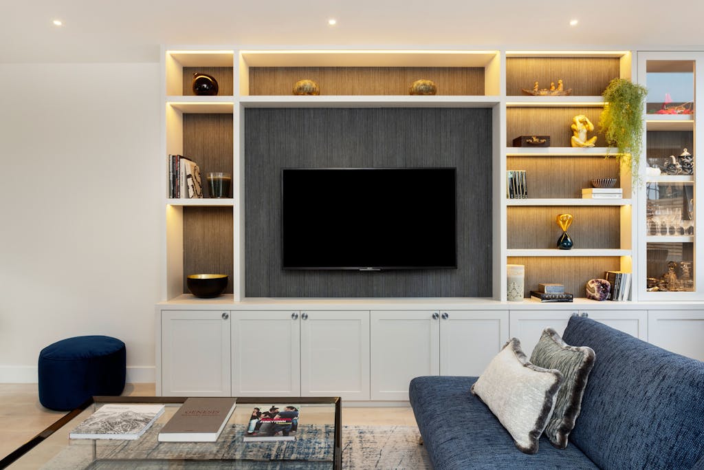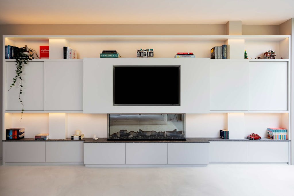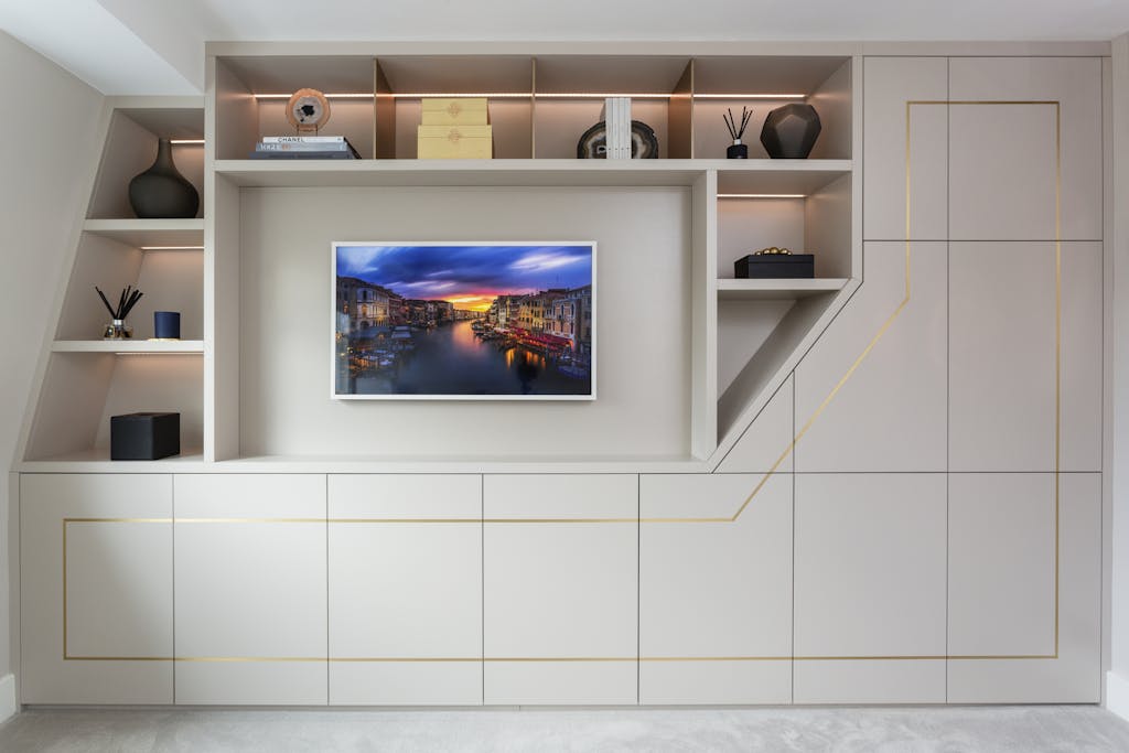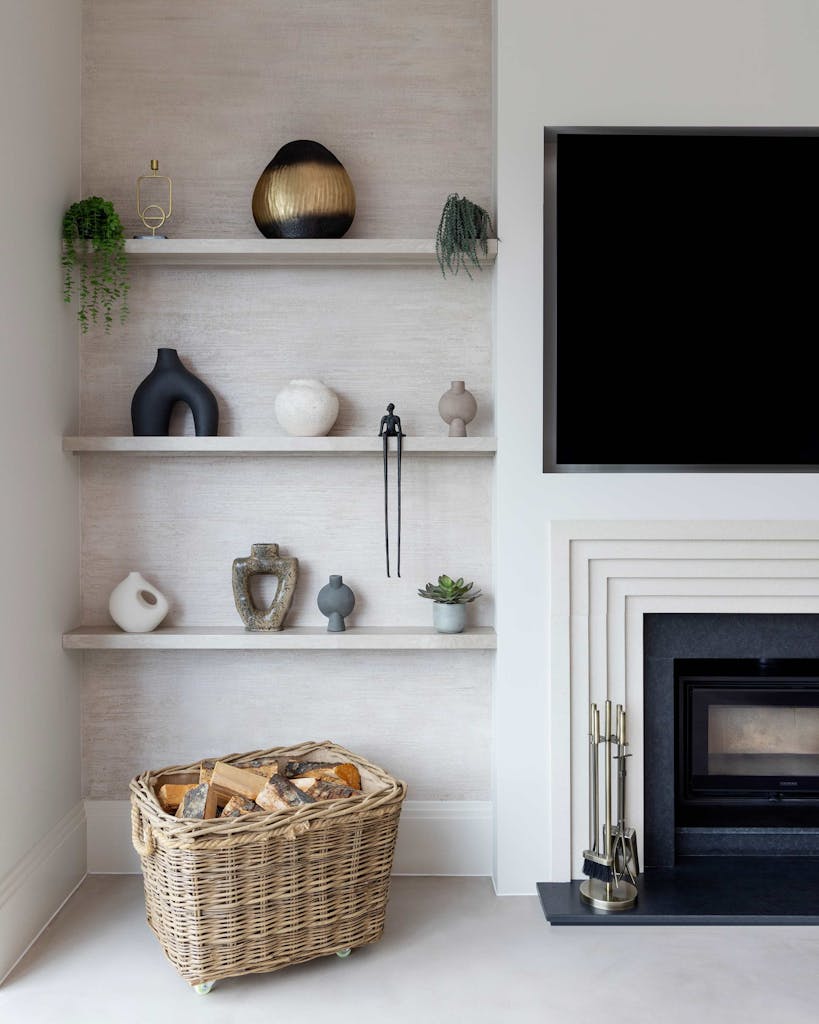 One of the most striking trends in modern interiors is the feature wall of bespoke joinery, often designed to incorporate a fireplace, TV, or both. These architectural focal points bring balance and sophistication to a room, blending warmth, technology, and design into a seamless whole.