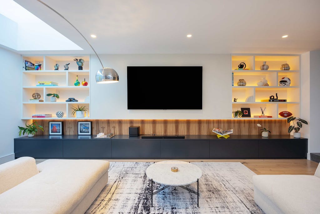 Perfectly suited to contemporary interiors, a bespoke media or fireplace wall works just as beautifully in a basement cinema, a luxurious living room, or an open-plan family space.
