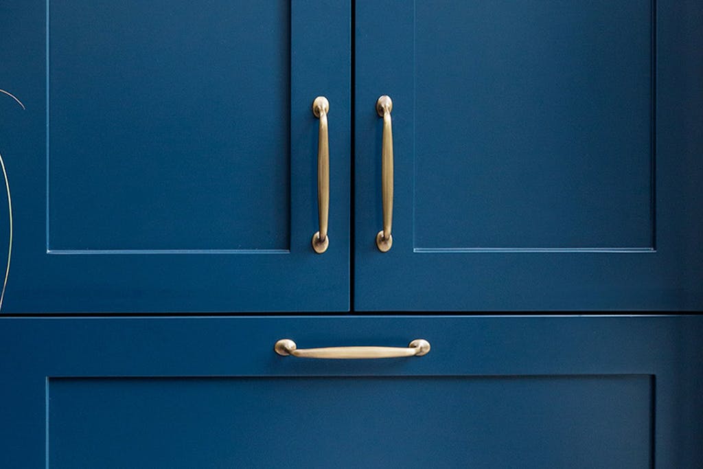The handmade shaker style kitchen cabinetry is made bespoke with solid timber dovetail drawers, finished in a deep ultra-marine shade and completed with an organic white Caesarstone top. A variety of natural textures in the kitchen space, such as hammered brass, marble and fluted glass, add an additional touch of personality to the scheme. Opposite the kitchen, a bespoke display wall of shelving cleverly conceals the TV behind fluted glass sliding doors.