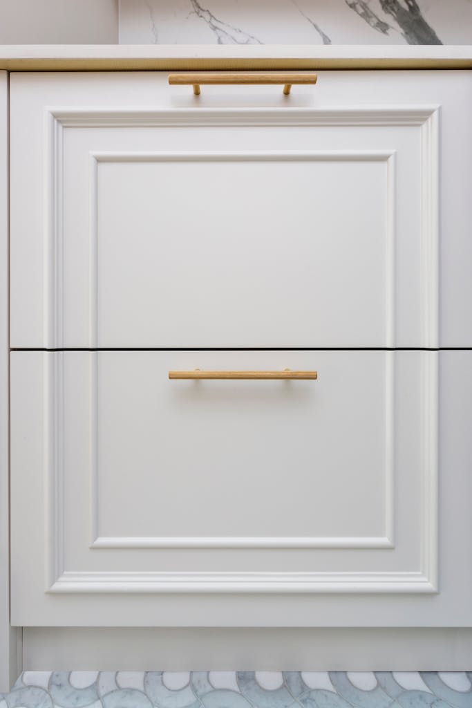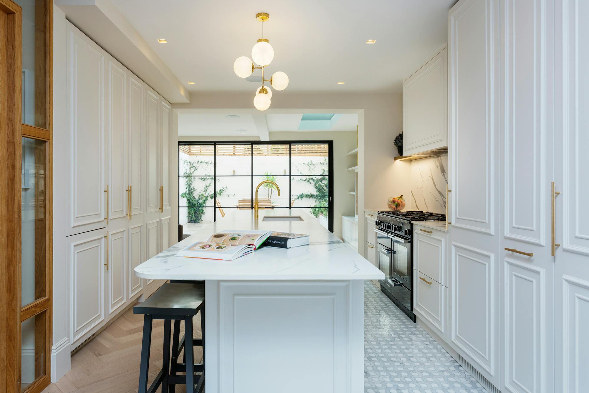 HUX revamped a family kitchen in a Kensington 5-bedroom terrace, working with French architect Charlotte Lilford. The kitchen features a timeless door style with applied beading, modernised by extending the beading across multiple drawer fronts. The exterior boasts a contemporary satin spray-painted finish, contrasting beautifully with the dark grey veining of the porcelain worktop on the 3.5m long island.