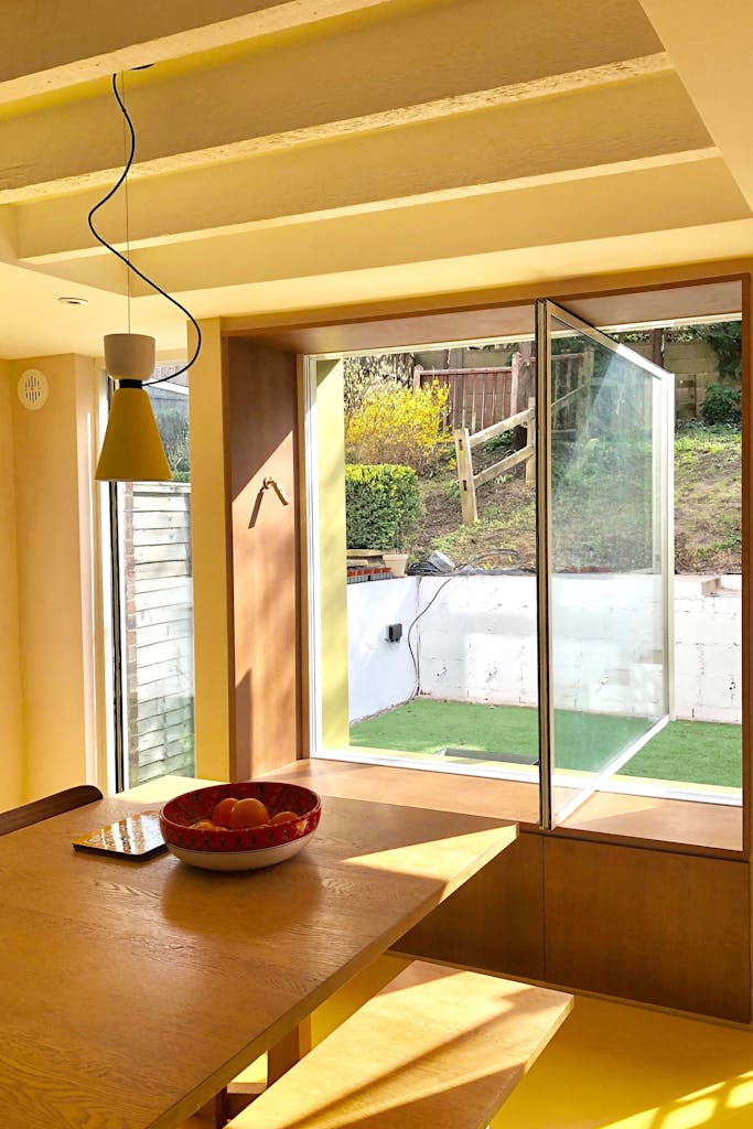 Floor to ceiling cabinets cleverly conceal the larder and matching wall panelling runs around the walls to discreetly hide access to a utility and WC. Additional storage is incorporated beneath the pivoting window reveal, doubling as a window seat. This kitchen ingeniously marries retro style and contemporary finishes, with a nanotech fingerprint and scratch resistant Fenix worktop. The colourful decorative pendant lights above the dining area both of which offset the retro cabinetry design.