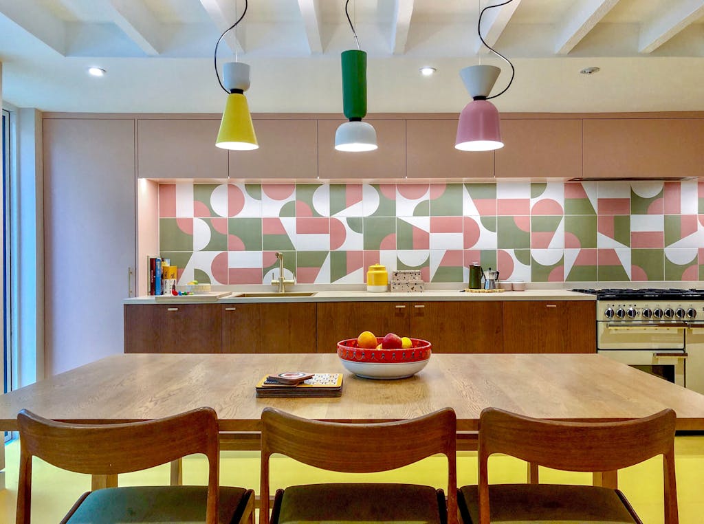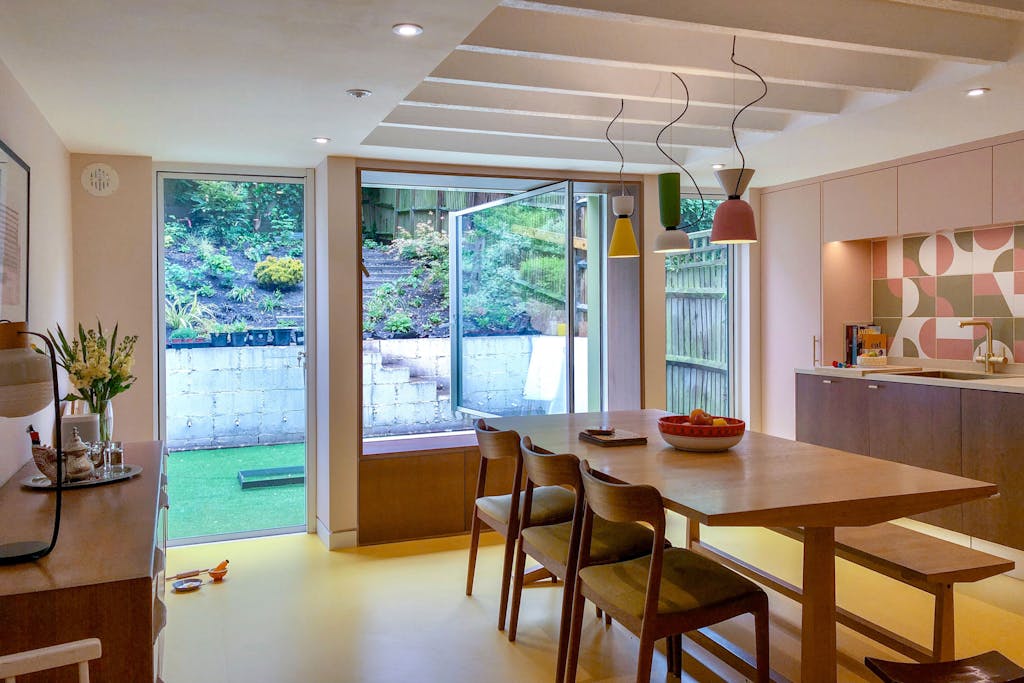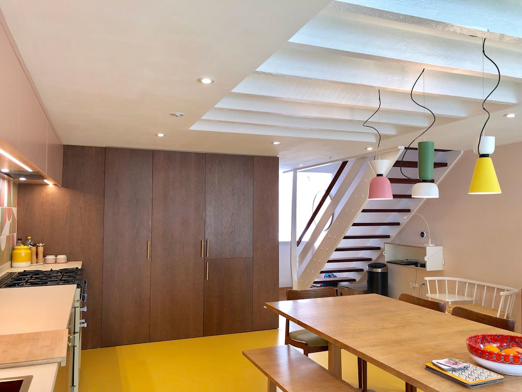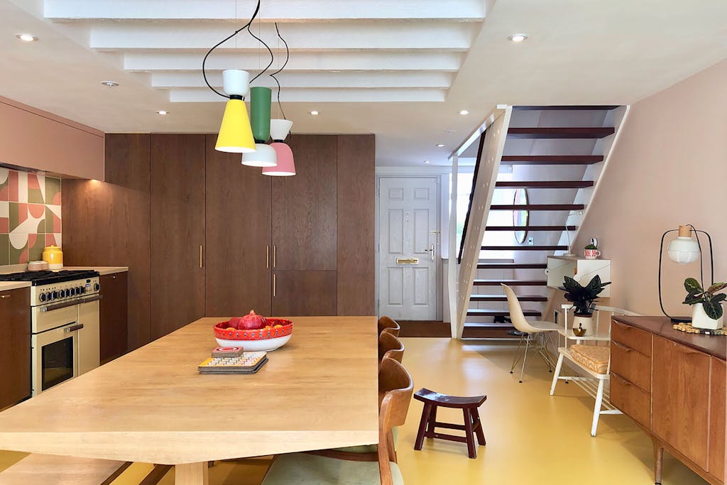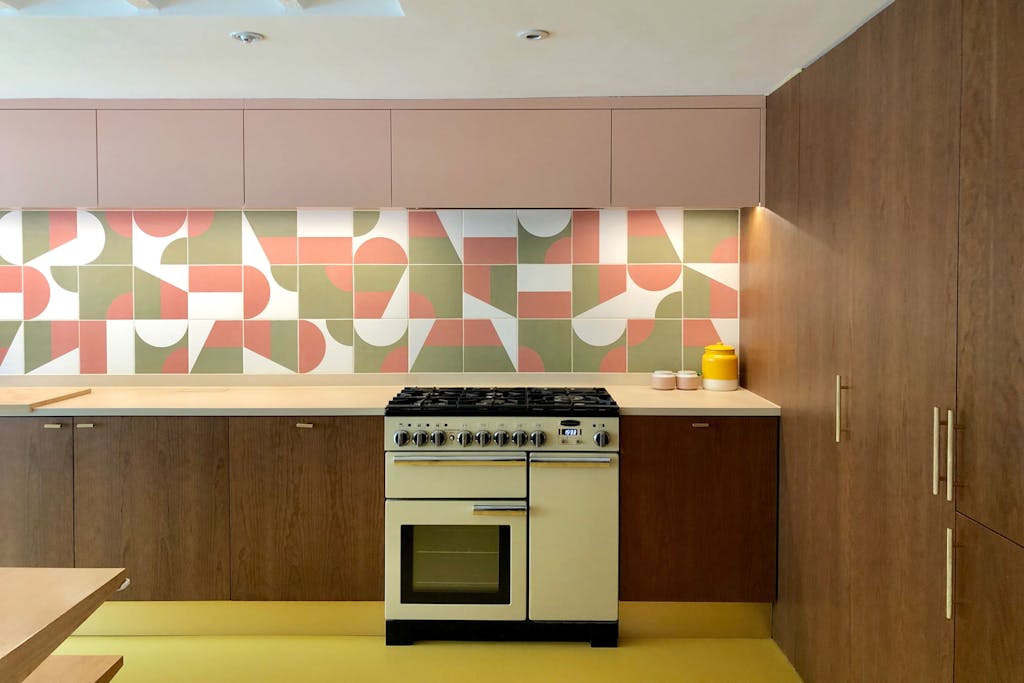 HUX was briefed for this project to create a bespoke joinery package for a kitchen and dining space in Dulwich, complete with a unique retro feel. The striking 70’s style tiles are the highlight of the room, bringing the whole space together. These were the starting point for the designer’s scheme. Storage was a priority, so HUX designed two tone cabinetry in cherry wood veneer and pale pink spray-lacquer to complement and surround the tiling. Horizontal lozenge wall units compensate for the low ceiling height.