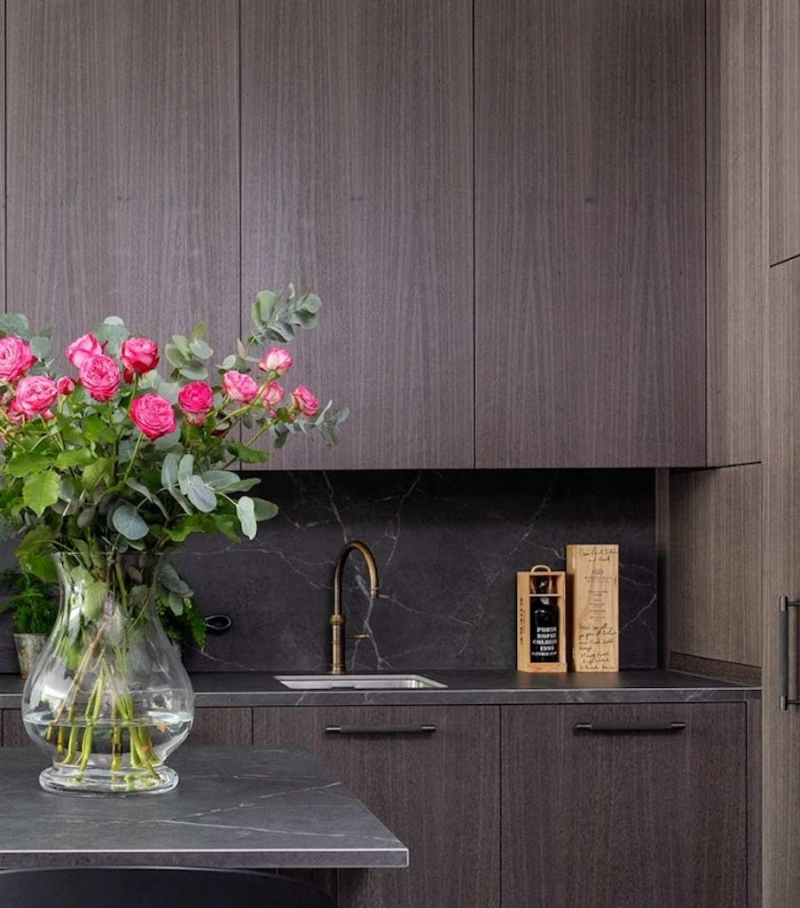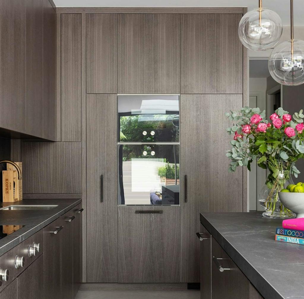 In this Kensington terraced home, HUX crafted a sleek and sophisticated kitchen, perfectly reflecting the client’s design brief. The cabinetry is clad in Metallic Grey Silkwood veneer, combining wide reeded and flush doors for a dynamic, textured aesthetic. A striking Caesarstone porcelain worktop with a shark nose overhang forms the centrepiece of the island, complemented by smoked bronze handles.