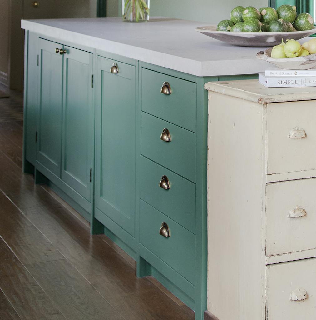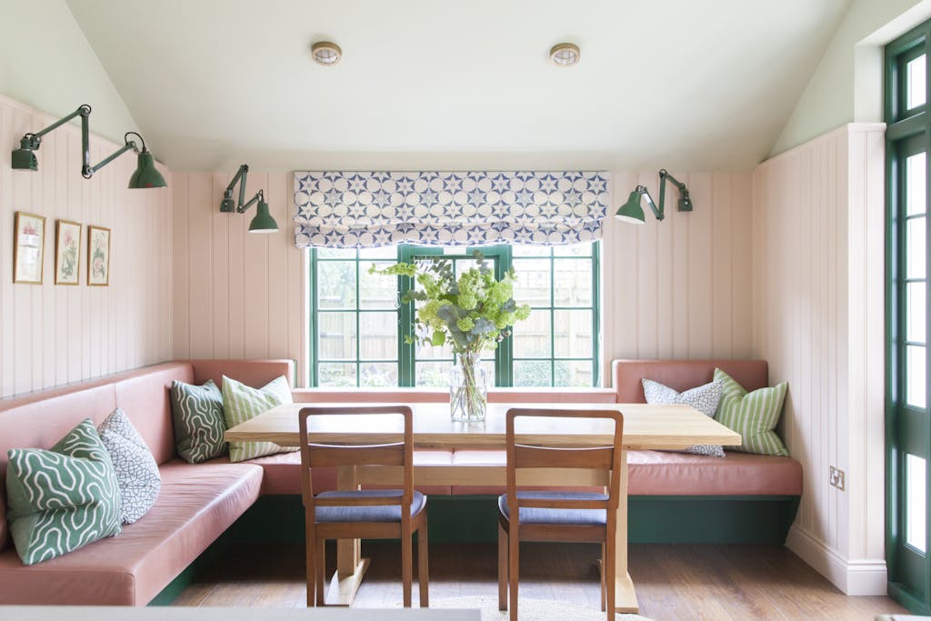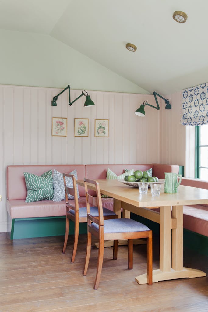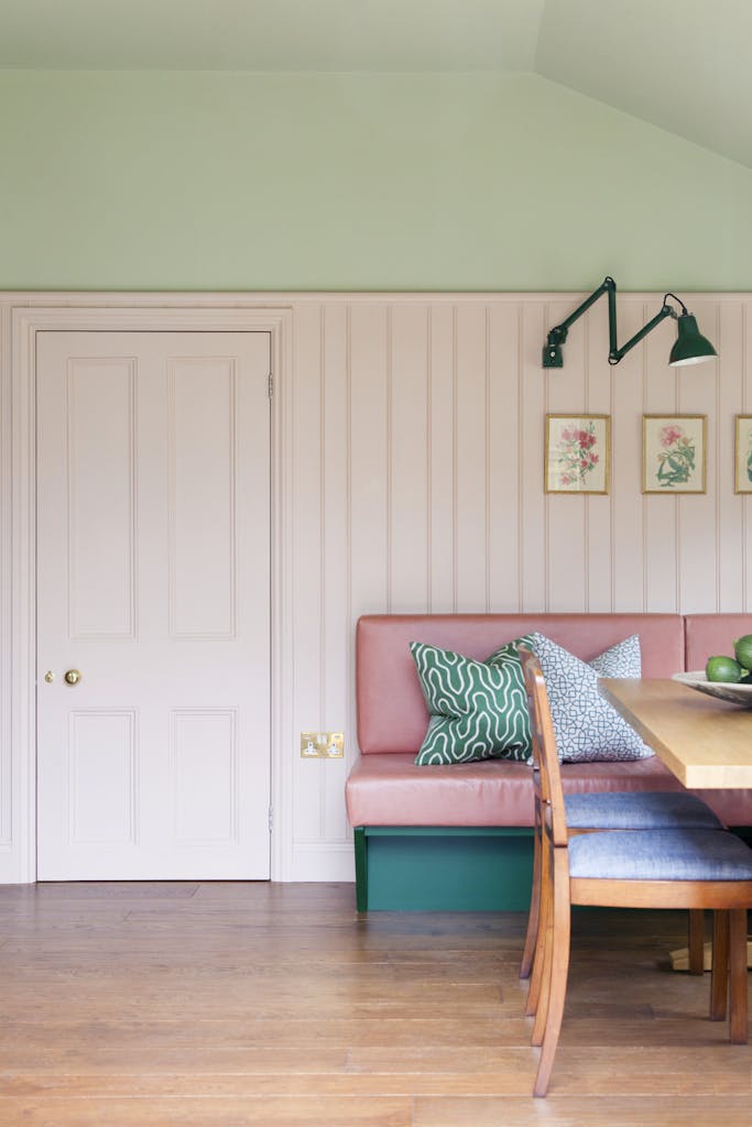 With the vision to rejuvenate an Arts & Crafts-style family home, we created a kitchen that marries bold colours with traditional charm. Vivid greens and blues contrast beautifully with pastel backdrops, with in-frame shaker cabinets and a mix of creamy and textured Caesarstone worktops adding unique visual depth. Aged brass finishes and antique drawers balance the playful elements, including pink splashback tiles and star print blinds.