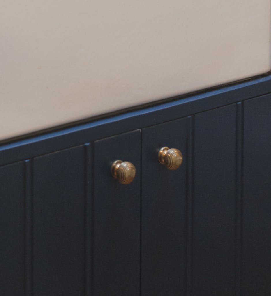 We brought this narrative to the utility and pantry spaces, with hand-painted cabinetry in a deep dark blue. Thoughtful features like bespoke solid oak bottle and spice racks, a ceramic butler’s sink, and an open bookcase inject an old-world charm, while maintaining functionality.