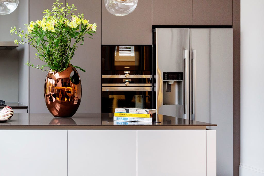 The starting point for this contemporary kitchen design was the idea of using two different tonal paints and double width units with Aventos lift-up hinges, ensuring plenty of storage space but still maintaining a minimal feel. The floating worktop adds depth and the satin smooth taupe spray-paint finish completes the elegant scheme. An L-shaped island in the centre of the space creates a clever ad hoc dining area, adds to the expansive feeling of space and wraps down to the floor in solid oak, stained to complement the floor.