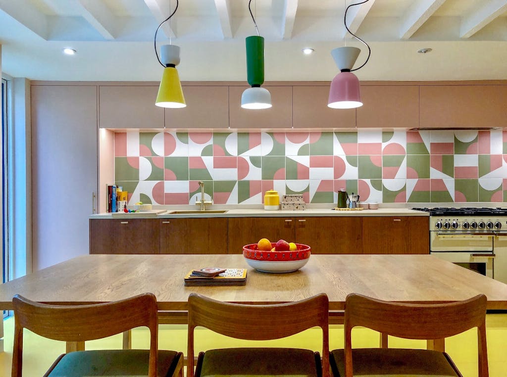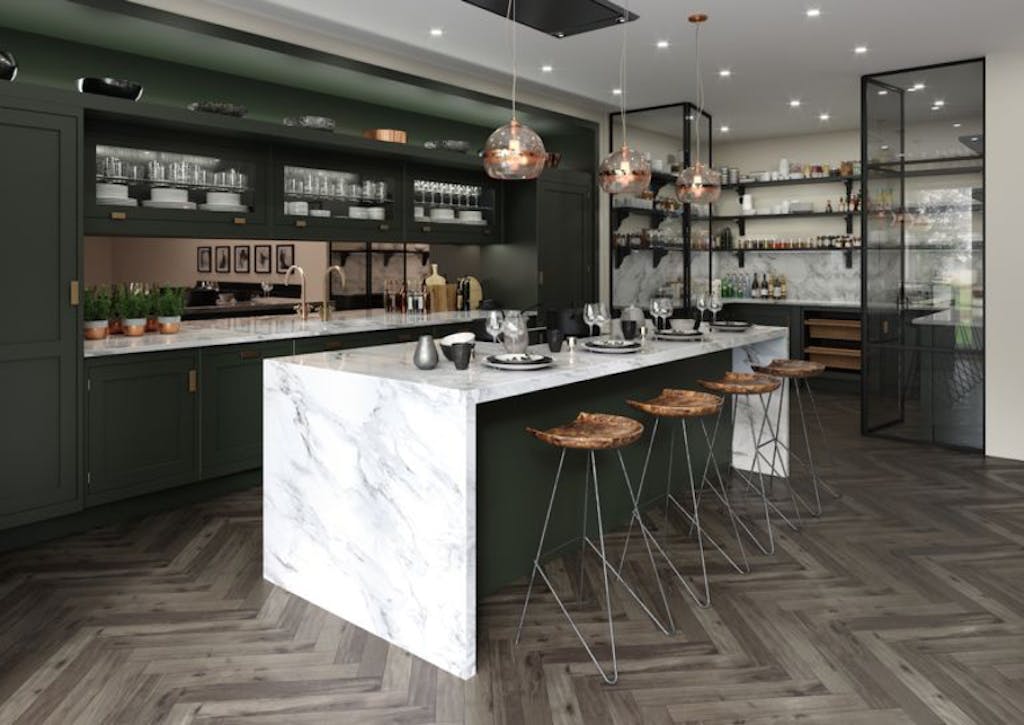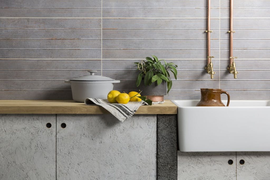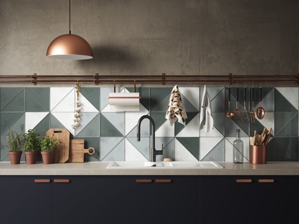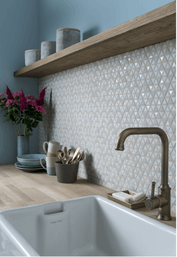 Do you like the idea of designing a kitchen splashback that uses pattern to create interest but doesn’t overwhelm a space? Opt for patterned tiles in muted shades for a unique yet pared back finish. We love how these Cool Triangles Tiles but there are many geometric designs on a hardwearing porcelain finish to choose from.