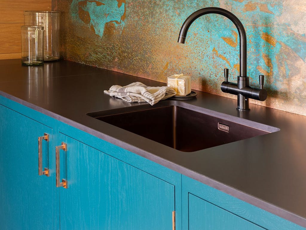 Follow the trend for warmer metals in the kitchen with a splashback that continues the theme. This copper splashback is matched with polished copper handles and has a Verdigris finish which is lacquer hand applied, making each piece unique. £690 per linear metre at standard height.