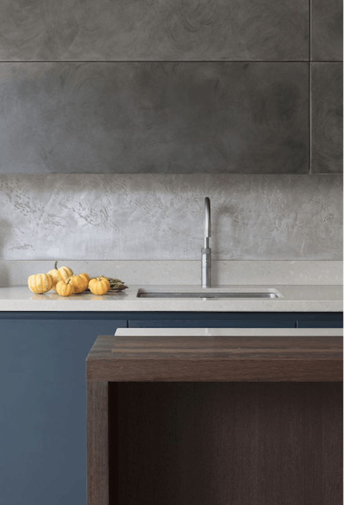 Polished plaster – a decorative plaster finish – can reproduce the look of different types of stone to stunning effect. In this kitchen, it’s teamed with a worktop upstand for additional protection at the base of the wall.