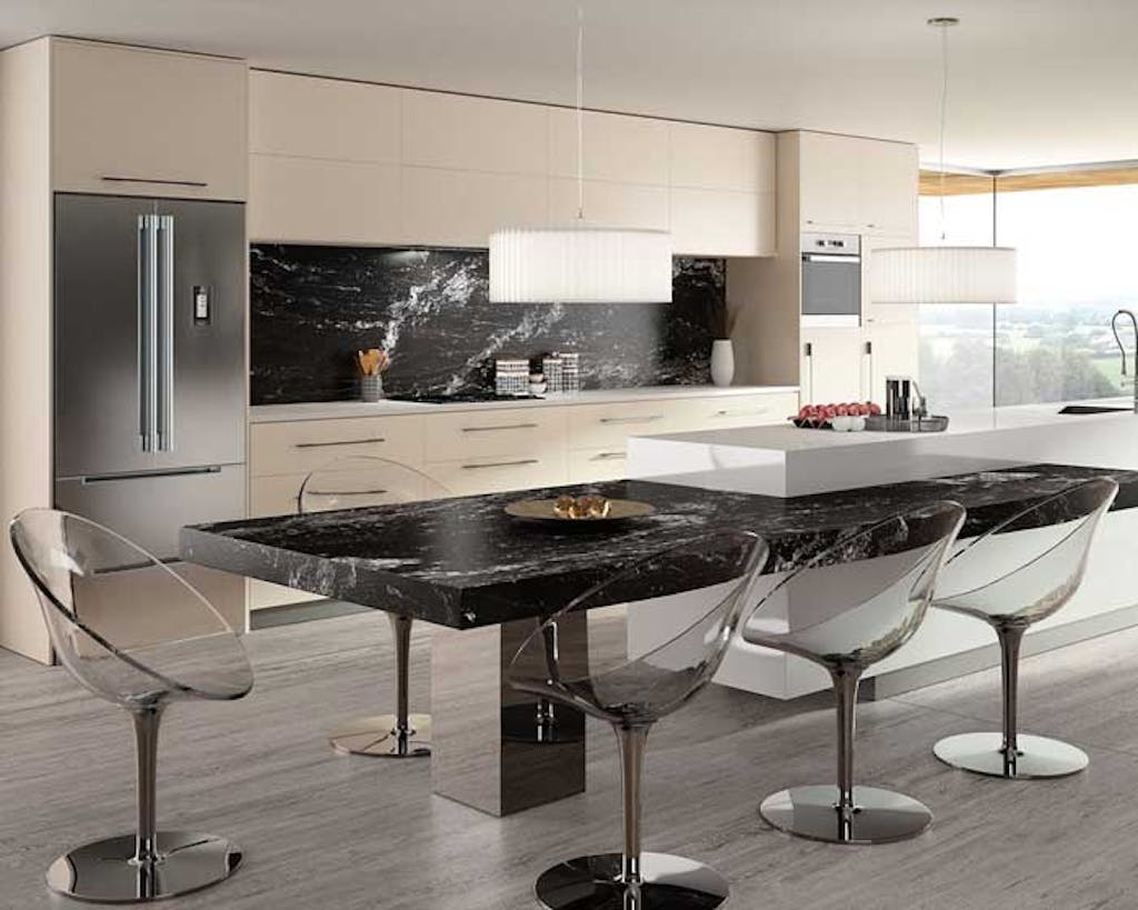 The splashback in this kitchen has been made by Dzek and it can be ordered in tiles or as one whole block, which is much more expensive but looks the real deal.
