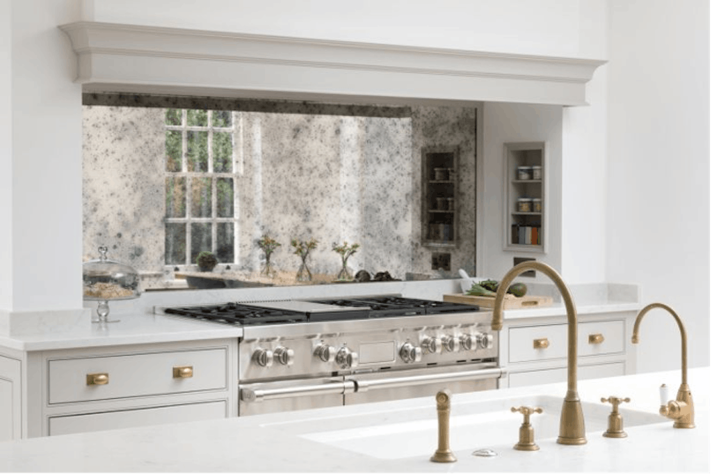 How about a glamourous kitchen? The devil is in the detail with gorgeous taps and a bespoke splashback. This kitchen features a bespoke antique mirror-effect splashback.