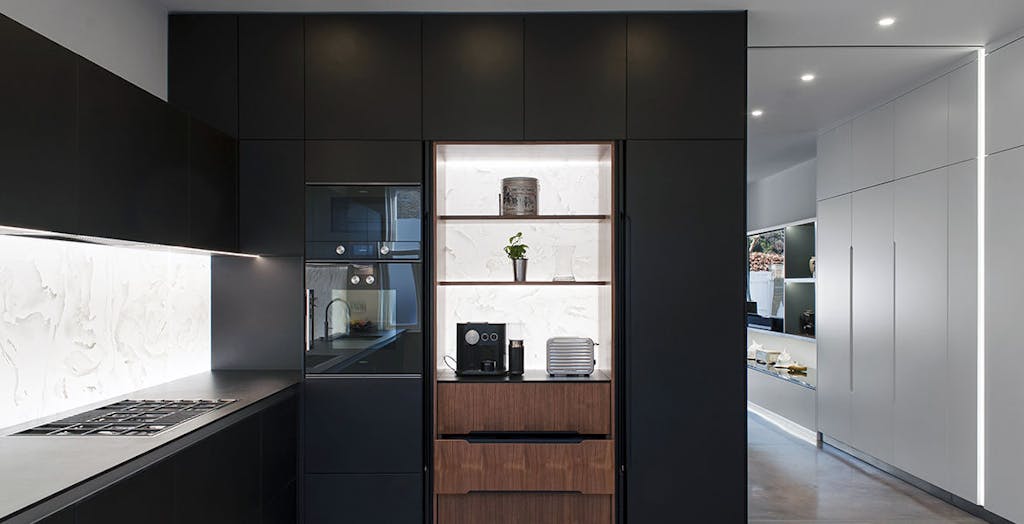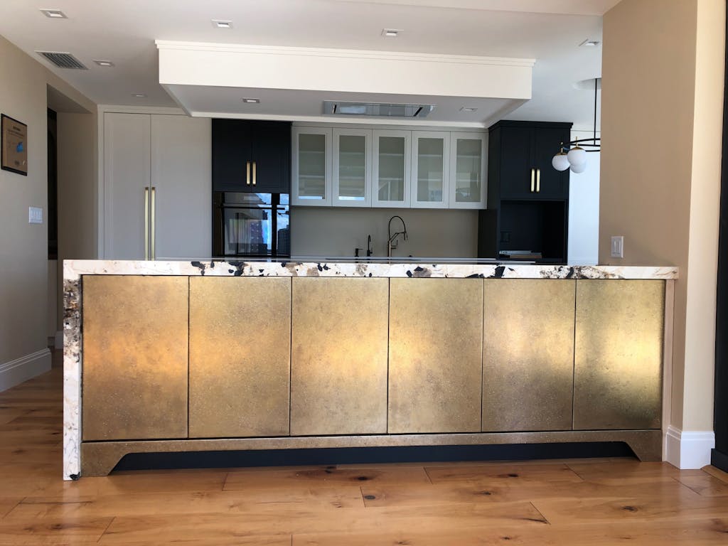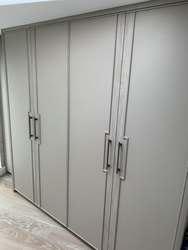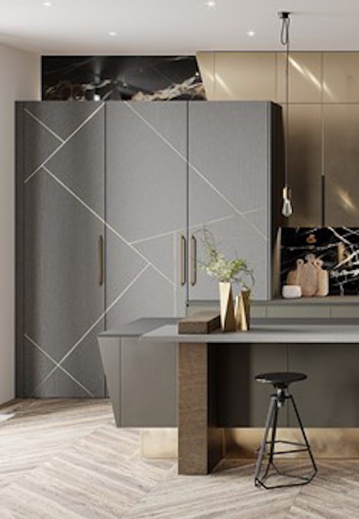For high-end products we typically use solid brass, but we can also create a similar and more cost-effective look using a metal effect board material cut into strips and inset into the door.